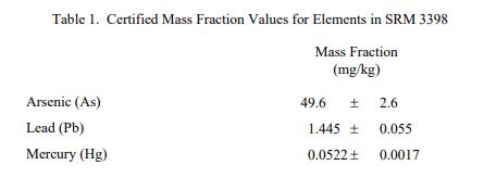 表 1 提供了 SRM 3398 中基于干質(zhì)量報告的痕量元素認(rèn)證質(zhì)量分?jǐn)?shù)值。NIST 認(rèn)證值是 NIST 對其準(zhǔn)確性有最高信心的值已知或可疑的偏倚來源已被調(diào)查或考慮 [1]。價值分配分析由 NIST 和合作實驗室進行。認(rèn)證值計算為 NIST 方法平均值的未加權(quán)平均值和合作實驗室平均值的加權(quán)中值(在適當(dāng)?shù)那闆r下)。相關(guān)的不確定性以大約 95% 的置信水平表示 [2-5]。