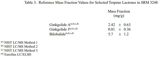 NIST SRM 3248銀杏片NIST 參考值是未經(jīng)認(rèn)證的值,它是基于可用數(shù)據(jù)對真實(shí)值的最佳估計(jì);但是,該值不符合 NIST 的認(rèn)證標(biāo)準(zhǔn) [1],并帶有相關(guān)的不確定性,這些不確定性可能僅反映測量再現(xiàn)性,可能不包括所有不確定性來源,或者可能反映多種分析方法之間缺乏足夠的統(tǒng)計(jì)一致性。表 3 中提供了其他萜內(nèi)酯的參考濃度值。表 4 中提供了砷、鎘和汞的參考值。