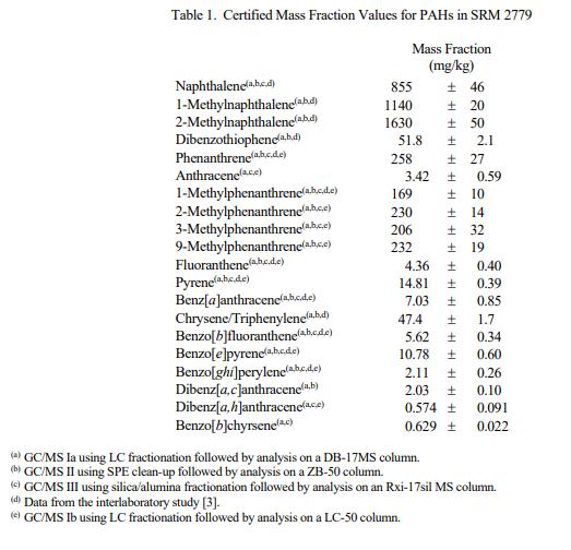 表 1 中提供了 21 種 PAH 的認證質(zhì)量分數(shù)值。NIST 認證值是 NIST 對其準確性有最高置信度的值,因為所有已知或可疑的偏差來源都已被調(diào)查或考慮在內(nèi)帳戶 [1]。認證值基于以下協(xié)議在 NIST 使用多種分析技術(shù)獲得的結(jié)果。