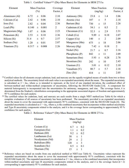 表 1 中提供了元素的認證濃度,以基于干質(zhì)量的質(zhì)量分數(shù) [1] 表示。認證值基于通過嚴格評估的獨立分析技術(shù)獲得的結(jié)果。 NIST 認證值是 NIST 對其準確性具有最高置信度的值,因為所有已知或可疑的偏差來源都已被調(diào)查或考慮在內(nèi) [2]。被測量是表 1 中報告的元素的總濃度。計量溯源性為 SI 質(zhì)量單位,表示為導(dǎo)出的質(zhì)量分數(shù)單位。