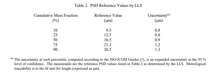 NIST SRM 1985 碳化鎢/鈷(標(biāo)準(zhǔn)品)LLS 的參考 PSD 值列在表 2 中。參考值是未經(jīng)認(rèn)證的值,是對真實值的估計。但是,這些值不符合 NIST 認(rèn)證標(biāo)準(zhǔn),并且提供了相關(guān)的不確定性,可能僅反映測量精度,可能不包括所有來源不確定性,或可能反映多種分析方法之間缺乏足夠的統(tǒng)計一致性 [1]。