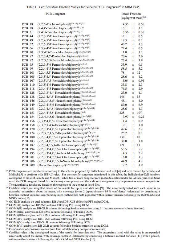 測量值是分別在表 1、2 和 3 中提供的每種 PCB 同系物、氯化農藥和 PBDE 同系物的總質量分數。計量溯源性是質量分數的 SI 派生單位(以微克/千克濕基表示)。 NIST 認證值是對其準確性有最高置信度的值,因為所有已知或可疑的偏差來源都已被調查或考慮在內 [2]。 PCB 同系物、氯化農藥和 PBDE 同系物的認證值基于 NIST 從兩種或多種化學獨立分析技術獲得的結果與實驗室間比較研究結果的一致性。