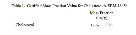 表 1 至表 3 提供了 SRM 1845a 中膽固醇、元素和維生素的認證質(zhì)量分數(shù)值,按原樣報告,在表 1 至 3 中提供。NIST 認證值是 NIST 具有最高置信度的值其準確性在于所有已知或可疑的偏差和可變性來源已考慮[1]。價值分配分析由 NIST 和合作實驗室進行。認證值計算為 NIST 方法的平均值和合作實驗室提供的結果平均值的中位數(shù)或平均值(如果適用)。相關的不確定性以大約 95% 的置信水平表示 [2-4]。