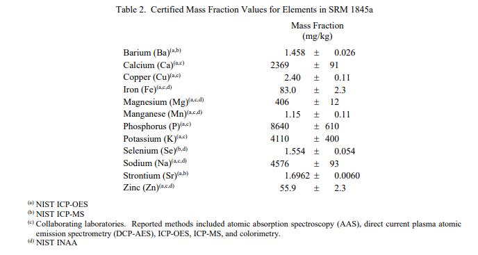 表 4 至 8 提供了 SRM 1845a 中其他分析物的參考質(zhì)量分數(shù)值,按原樣報告。NIST 參考值是非認證值,是基于真實值的最佳估計關于可用數(shù)據(jù);但是,該值不符合 NIST 標準認證 [1] 并提供相關的不確定性,這些不確定性可能僅反映測量再現(xiàn)性,可能不包括所有不確定性來源,或者可能反映多種分析方法之間缺乏足夠的統(tǒng)計一致性。參考質(zhì)量分數(shù)值來自 NIST 和/或合作實驗室報告的結果。