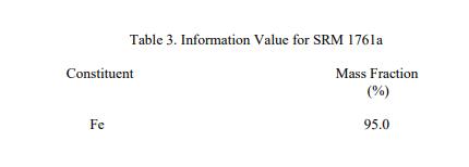 表 1 報(bào)告了 SRM 1761a 的 14 種成分的認(rèn)證值。表 2 報(bào)告了七種成分的參考值。表 3 報(bào)告了 Fe 的信息值。對(duì)于所有元素,值都以質(zhì)量分?jǐn)?shù)報(bào)告 [1]。賦值類別基于 NIST 用于化學(xué)參考材料 [2] 的術(shù)語(yǔ)和模式的定義。