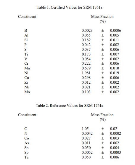 SRM 1761a 的值分配基于此 SRM 與原始 SRM 1761 的完整、高精度比較。SRM 1761a 的材料被證明與所有元素的原始材料沒(méi)有區(qū)別,除了 C、N 和 V . SRM 1761a 的賦值被認(rèn)為可以直接追溯到用于 SRM 1761 賦值的主要參考物質(zhì)和校準(zhǔn)。C 和 N 的賦值是使用基于 SRM 1761 的校準(zhǔn)通過(guò)燃燒和紅外檢測(cè)獲得的。V 的賦值是通過(guò) X 射線熒光光譜法獲得的基于低合金鋼 SRM 1761 至 1768 的校準(zhǔn)。在此證書(shū)中列出了賦值中采用的測(cè)試方法。