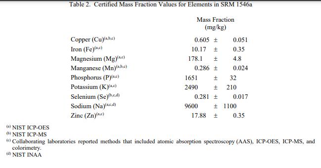 表 1 至表 3 提供了 SRM 1546a 中膽固醇、元素和維生素的認證質量分數(shù)值(按原樣報告)。 NIST 認證值是 NIST 具有最高置信度的值在其準確性方面,所有已知或可疑的偏見來源都已被考慮到[1]。價值分配分析由 NIST 和合作實驗室進行。認證值計算為 NIST 方法的平均值和合作實驗室提供的結果平均值的中位數(shù)或平均值(如果適用)。相關的不確定性以 95% 的置信水平表示 [2-4]。
