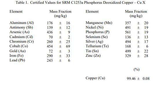 NIST SRM C1253a 磷脫氧銅–Cu X(標(biāo)準(zhǔn)品)主要用于評(píng)估化學(xué)分析方法和校準(zhǔn)用于分析銅及其合金的儀器方法。 SRM C1253a 的一個(gè)單元由一個(gè)定向凝固的冷鑄塊組成,大約 32 毫米見(jiàn)方和 19 毫米厚。