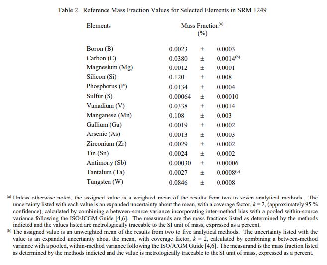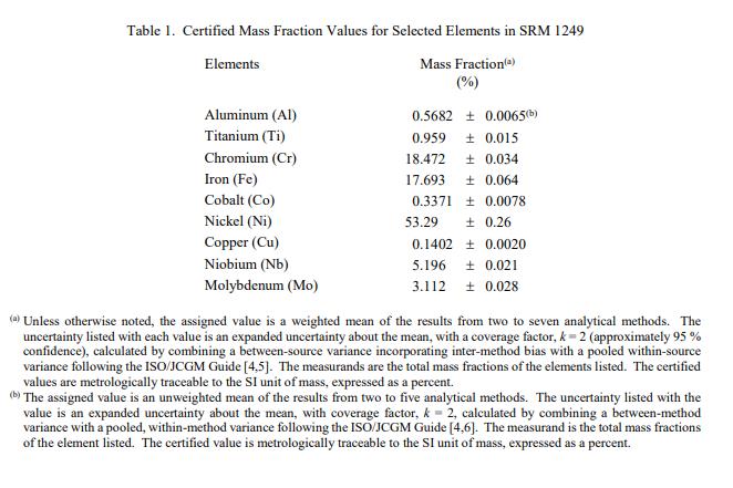 表 1 中提供了選定元素的認(rèn)證質(zhì)量分?jǐn)?shù)值。所有值均以質(zhì)量分?jǐn)?shù)報告 [1]。 NIST 認(rèn)證值是 NIST 對其準(zhǔn)確性有最高置信度的值,因為所有已知或可疑的偏差來源都已調(diào)查或考慮在內(nèi) [2]。一個認(rèn)證的值是根據(jù) NIST 和合作實驗室使用表 4 中列出的測試方法進(jìn)行的分析結(jié)果對真實值的當(dāng)前最佳估計值。與值一起列出的不確定度是擴(kuò)展不確定度(95 % 置信度)[3],根據(jù)計算得出ISO/JCGM 指南 [4] 中的方法。